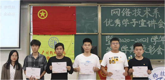 本网讯 为贯彻落实立德树人根本任务,深挖榜样价值内涵,激励先进,总结经验,发扬成绩,全面促进学风建设。网络技术系于10月29号19:00-20:30在学院T101课室举行榜样学子宣讲会暨2020-2021学年第二学期学风班风建设表彰大会。莅临本次大会的嘉宾有学习导师原振文教授、曹春华老师,网络技术系团委书记兼学工办主任唐志辉老师,网络技术系团委副书记兼学生会秘书长邝晓彤老师,网络技术系辅导员张丽老师、余沁芯老师,实习辅导员莫茂照老师。本次大会由系团委学生会文娱部徐亚东、黄淳梓主持。