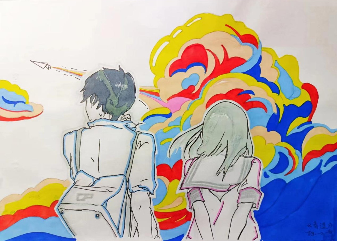 作品简介:少年时代浅尝辄止的心动,青涩得仿佛未成熟的果实,在明媚的春日含苞待放,期盼着盛开。青春的尽头从来不是十八岁,是盛夏,是蝉鸣,是刺眼的阳光,是热烈的少年。背景采用彩云色调,寓意着青春的色调五彩斑斓,纸飞机冲上云霄,自由是最热烈的远行。