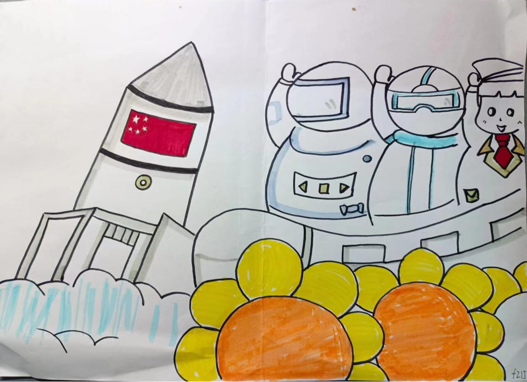 作品简介:前面的两个巨大的向日葵代表着中国青年欣欣向荣的精神面貌;左边的火箭代表中国航天航天事业的发展;左边的宇航员小人代表中国的科研,中间穿着防护服的小人代表医护人员,右边穿着警察制服的小人代表中国军人。