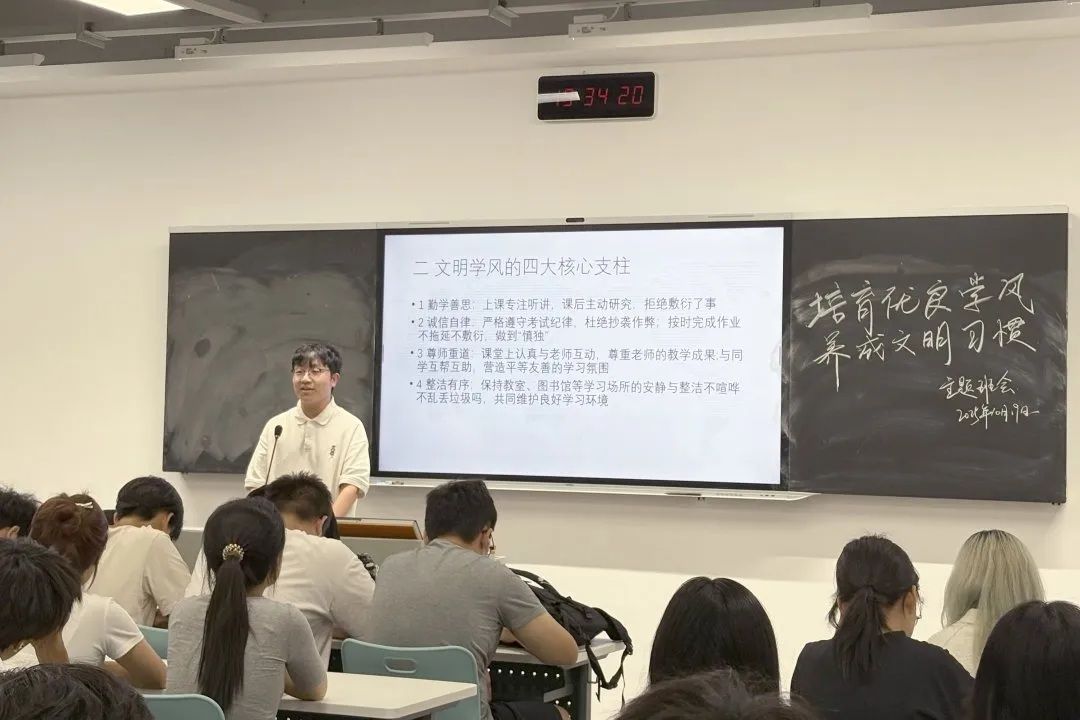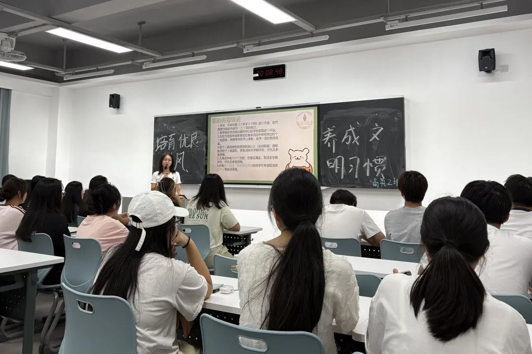 各学院创新形式让学风建设“活”起来。网络空间安全学院以“书信传情”组织学生书写成长印记与未来憧憬,在回望展望中锚定学习方向;电子信息与控制工程学院借“九宫格连线”游戏导入主题,结合学委、导生经验分享,引导学生探索时间管理;外国语学院商英 1 班以“击鼓传花”促学生分享大学学习特点,翻译班用网络热梗、主题视频让“文明学风”深入人心,提升参与度。