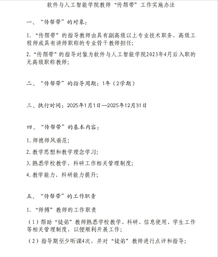 软件与人工智能学院实施教师 “传帮带” 计划,制定《软件与人工智能学院关于成立2025年“传帮带”小组的决定》,通过“师傅”教师带动“徒弟”教师在教学、指导学生竞赛等方面给予指导与帮助,创造条件促进教师培育学院学风建设。215名全院教师中,931人次参与学生课外学术竞赛指导,为学子专业成长保驾护航。