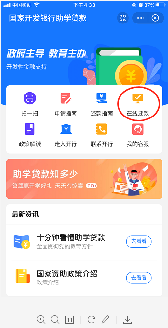 3. 进入国家开发银行助学贷款界面,点击【在线还款】。