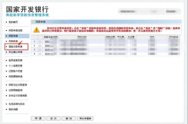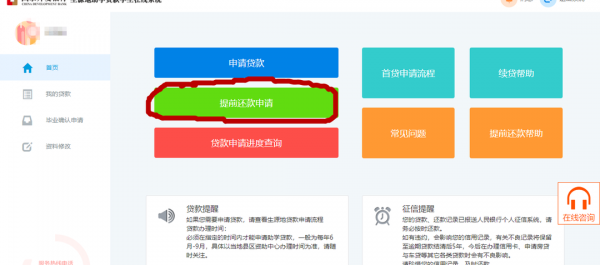 通过个人首页,校园地贷款点击左侧【提前还款申请】进入还款申请,生源地点击界面中间【提前还款申请】进入提前还款申请。