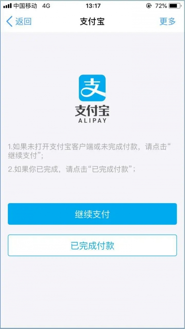 5. 如果未打开支付宝客户端或未完成付款,点击【继续付款】