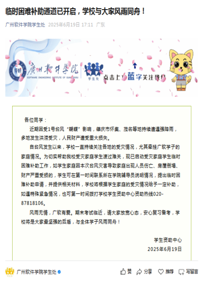 每当全国各地区遭受暴雨、洪涝、地震等自然灾害时,学校总在第一时间启动受灾学生情况排查,为有需要的学生畅通临时救助通道,全年为27名因灾、因病导致家庭困难的学生提供临时困难补助,全力保障学生在校安心学习、生活。
