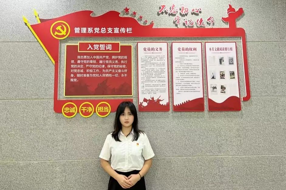 在进入大学时,家庭经济困难的她接受到国家助学金、学校新生专项、勤工俭学等一系列资助,她认识到个人的成长与进步离不开党的领导和国家的栽培。因此在大一时,她便递交了入党申请书,积极向党组织靠拢,积极参加青马班培训、党史知识竞赛等党组织活动,深入学习党的理论、方针和政策,时刻以共产党员的标准严格要求自己,提升个人政治修养。经过不断努力,她于2024年5月发展成为一名中共预备党员。她深刻体会到,中国共产党是全心全意为人民服务的政党。这种坚定的信仰和崇高的理想,成为了她不断前进的动力。入党不仅是一种荣誉更是一种责任与担当,在入党的过程中,她更加清晰地认识到自己应该成为社会的栋梁之材,为国家贡献自己的力量。