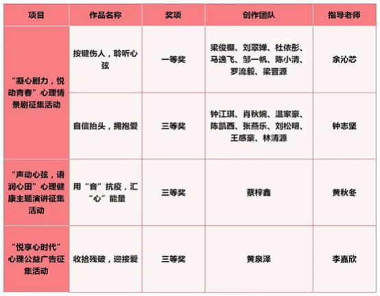 为增强大学生心理健康意识,推动高校心理健康教育内容与形式创新,广东省教育厅每年会重点主办大学生心理健康教育系列活动。今年“5·25”大学生心理健康月系列活动中,我校网络技术系余沁芯老师指导学生团队创作的心理情景剧作品《按键伤人,聆听心弦》荣获一等奖;党委宣传部钟志坚老师指导学生团队创作的心理情景剧作品《自信抬头,拥抱爱》、思政部黄秋冬老师指导学生的心理健康主题演讲作品《用“音”抗疫,汇“心”能量》以及数码媒体系李嘉欣老师指导学生创作的原创心理公益广告作品《收拾残破,迎接爱》分别获三等奖。此外,心理中心梁燕玲老师指导学生创作的心理漫画《残缺的蹁跹》入选广东省第11届岭南原生艺术公益展。