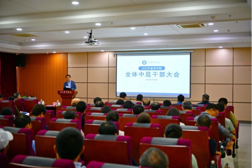 3月14日下午,我校在国际报告厅召开2025年春季学期中层干部大会。校长张强、党委书记兼督导专员刘友坤、副校长徐祥、副校长袁志、副校长曹广福、党委副书记兼纪委书记张广金、校长助理张屹以及全体中层干部、助理参加会议。会议由校长张强主持。