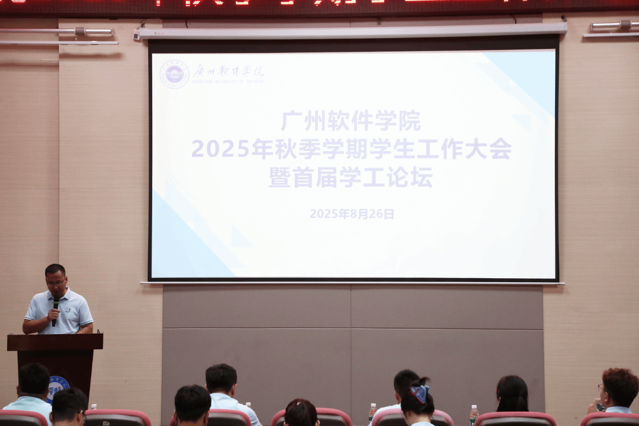 8月26日,广州软件学院召开2025年秋季学期学生工作大会暨首届学工论坛,为新学年的学生工作擂鼓出征、谋篇布局。会议凝聚共识、汇聚合力,全面部署新阶段学生工作方向,激励全体学工队伍以昂扬姿态投身育人一线,谱写立德树人新篇章。学校党委副书记张广金出席会议,学校全体学工人员齐聚一堂。本次大会由学生处副处长冯焯彬主持。