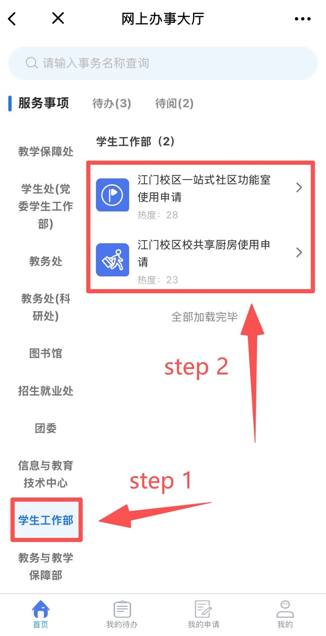 共享厨房申请:办事大厅---学生工作部---填写江门校区共享厨房使用申请表。