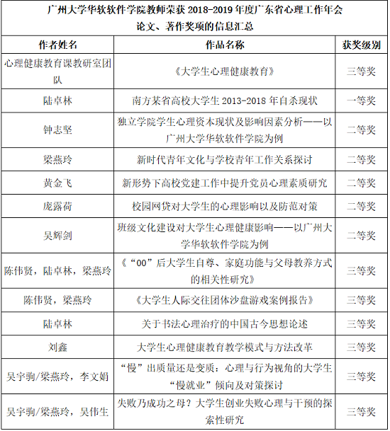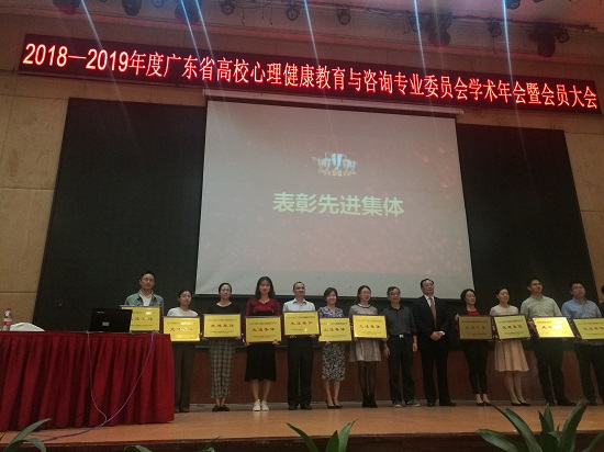 本网讯 2018-2019年度广东省高校心理健康教育与咨询专业委员会学术年会于11月13-14日在广东江门召开,本次大会共有来自省内102所高校的175名会员参加,我院学生处心理中心梁燕玲主任和陆卓林老师代表参加了会议。在心理工作年会上,我院心理健康教育与咨询工作荣获多项表彰,载誉而归。奖项分别是我院心理工作荣获“先进集体”称号,心理健康教育课教研室团队自编教材《大学生心理健康教育》荣获优秀出版物三等奖;学生处心理中心梁燕玲主任荣获广东省高校心理健康教育与咨询工作10年敬业奖,网络技术系辅导员曹璐婷老师荣获先进个人荣誉称号,陆卓林等9名老师的12篇论文分别获得优秀论文一等奖1项,二等奖5项,三等奖6项的佳绩。