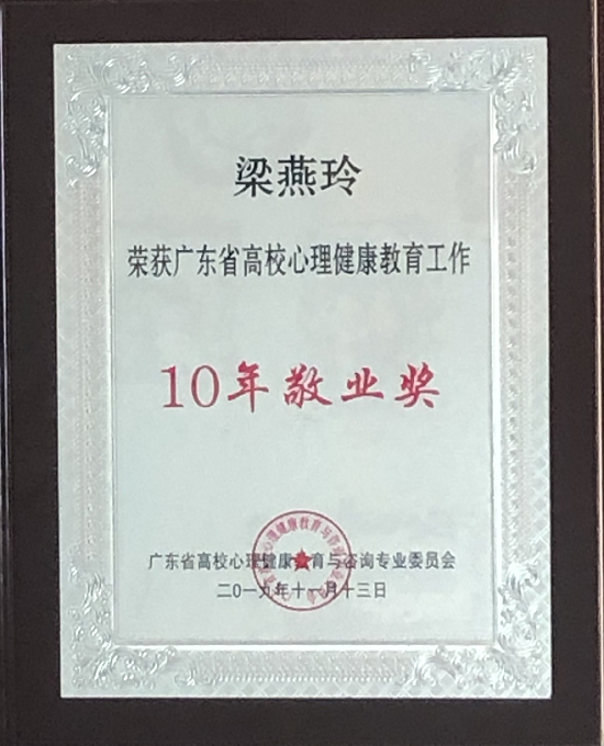 梁燕玲主任获广东省高校心理健康教育与咨询工作10年敬业奖