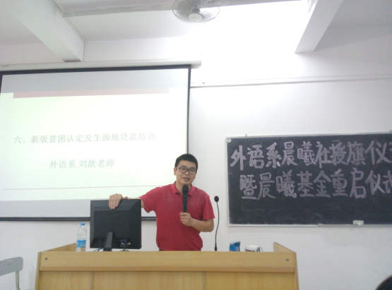 会上,刘歆老师还为社员们进行了新版贫困认定及生源地贷款的相关流程及注意事项等内容的培训。他强调每个有意向申请贫困认定、贷款(生源地贷款)的同学都要根据自己的实际情况,认真对待,对自己负责,自立自强、自助脱困。