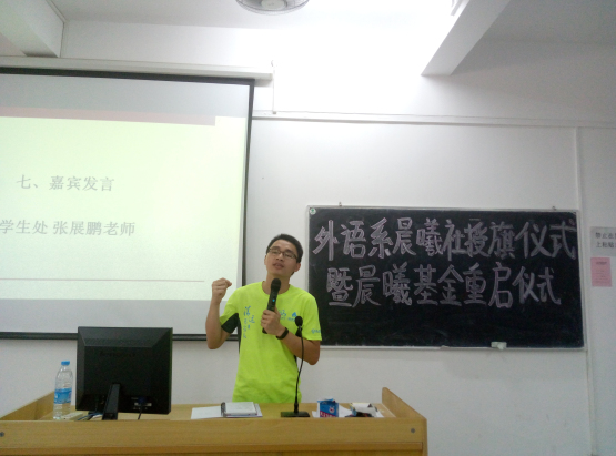 学院自强社副社长张展鹏老师最后发言。他首先对外语系晨曦社授旗仪式暨晨曦基金重启仪式的顺利举行表示祝贺。他指出,晨曦社将在互助、互爱过程中,为贫困学子自立自强、参与公益、完成学业梦想提供舞台。他认为,大学四年很短暂,每个大学生都应该“手勤脚勤,更应脑勤”,沉下心来思考自己未来的出路,树立目标,不断努力前进,不让自己的大学生活虚度。