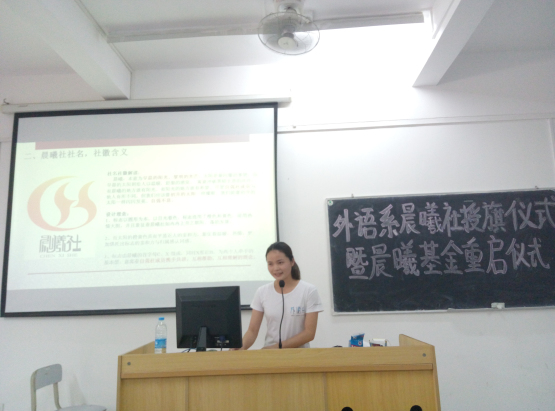外语系晨曦义教队队长钟淑华同学郑重宣布外语系晨曦基金会重启,并为与会人员介绍了基金会的组织架构及基金相关章程,包括基金会成立的目的,意义,管理、使用制度,资金来源、用途及申请流程。