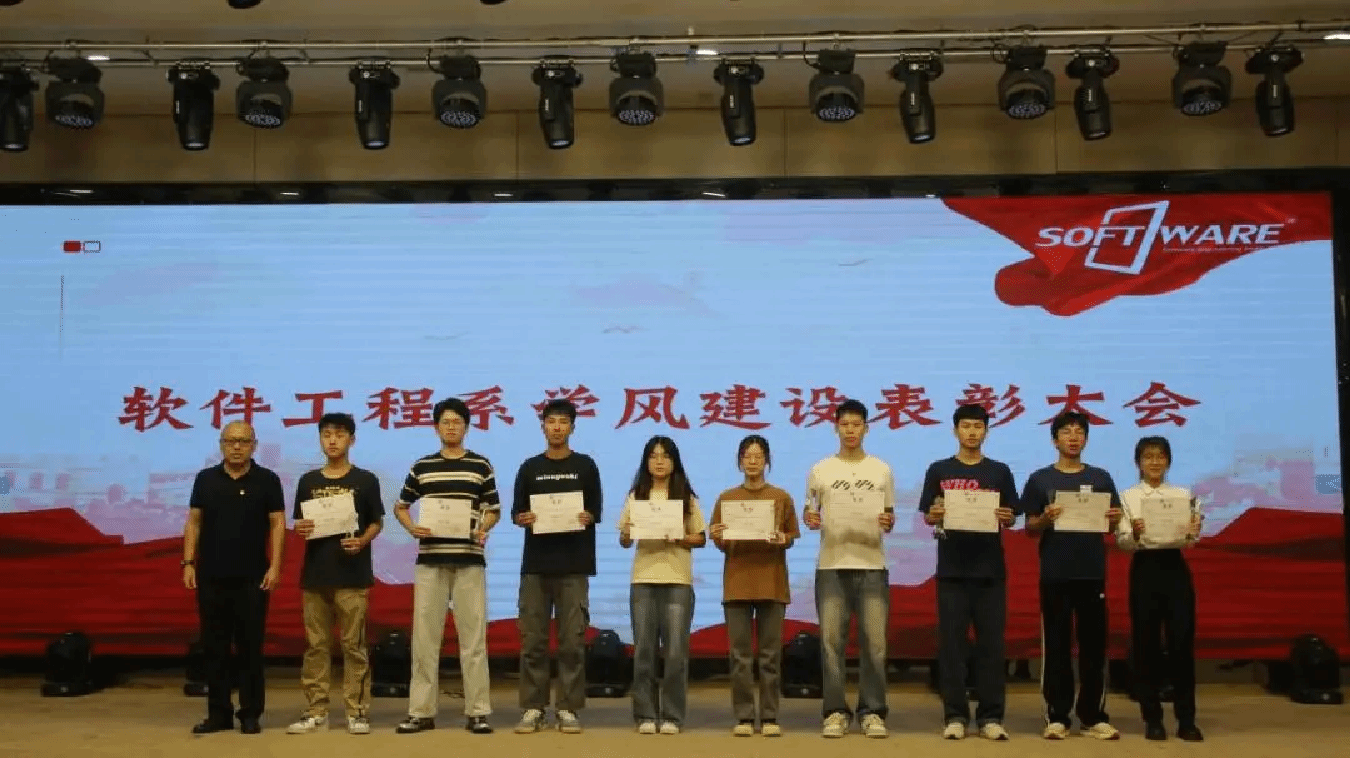 大会开始,由软件工程系三位优秀学子分别上台为24级全体新生分享自己在学习、干部工作与社会实践等方面的经验,希望各位新生可以以此为榜样勉励自己朝着优秀榜样的方向努力。紧接着是学风建设表彰大会,本次表彰旨在提高软件工程系学生的自主创新能力以及培养集体荣誉感。鼓励学生积极投入实践,提高学生的自我管理意识和自主能动性。