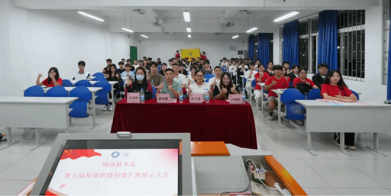 网络技术系于11月1日晚上20:30在学校T104召开第五届星级班级总结大会。会上,各班级代表依次上台展示本班在活动中取得的丰硕成果,并反思在本次活动中的不足之处。