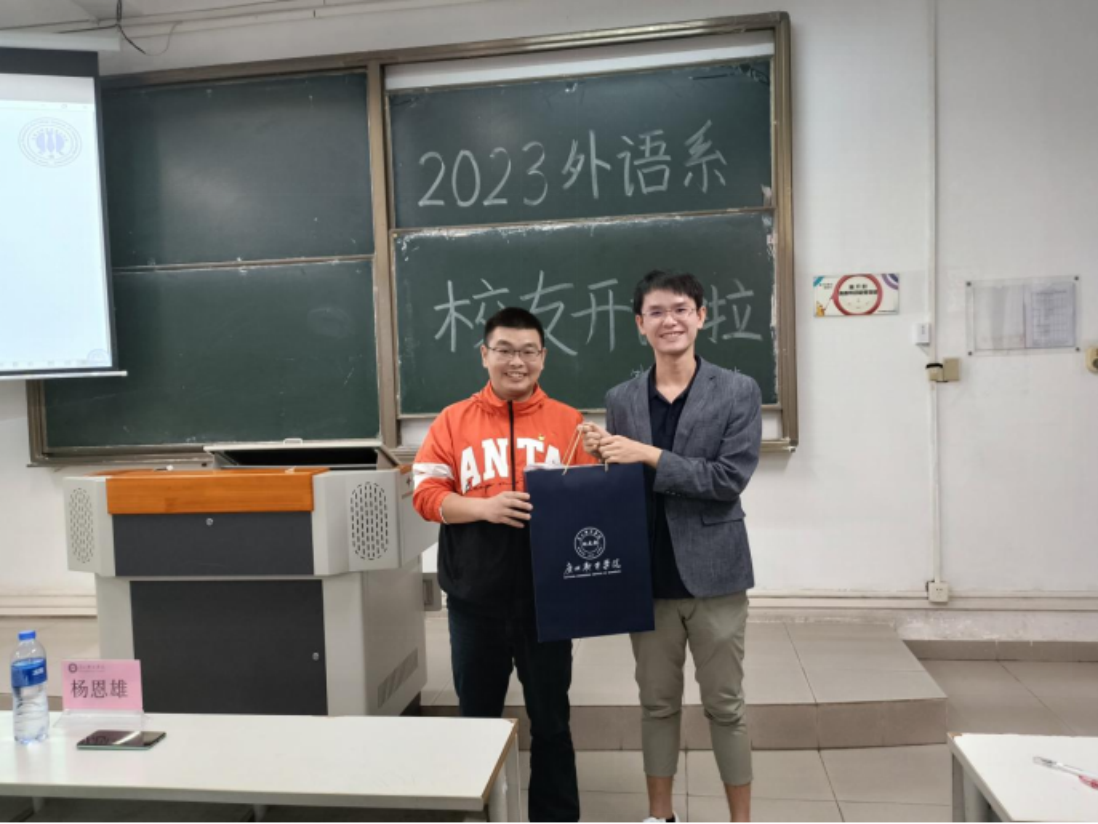 基于同学们对大学生犯罪问题的认识,刘歆老师再次提醒同学们,切不可触犯法律的底线,必须自觉遵守法律法规,并强调在遇到相关犯罪问题时,我们要学会利用法律法规来捍卫自己的权益。随后,刘歆老师代表外语系向杨恩雄师兄赠送了纪念品,以表达对师兄出席本次座谈会的感谢。