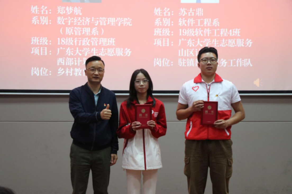 广州软件学院共青团就业导师,是我校共青团为广大青年朋友提供基层就业指导帮扶的重要帮手,宣讲会伊始,张广金副书记为共青团就业导师郑梦航、苏古鼎颁发了聘书,旨在为我校拓宽就业指导工作思路,助力我校就业帮扶。