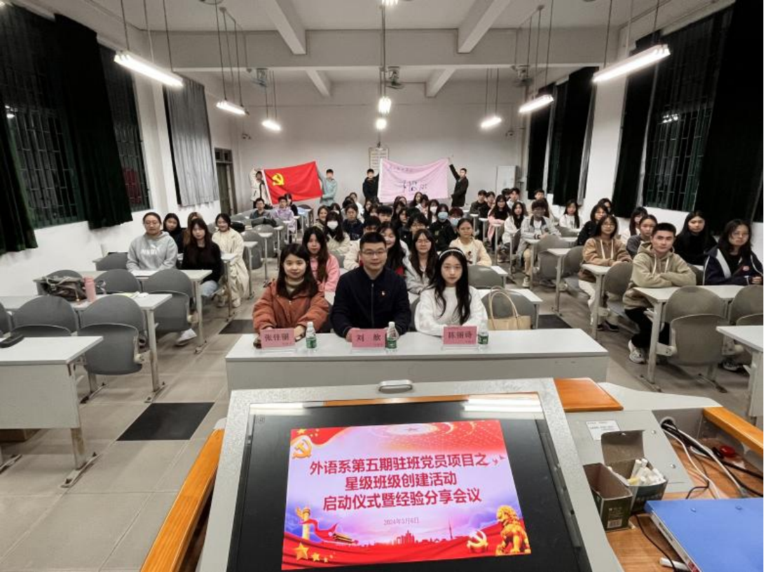 3月6日,外语系在C103举办了第五期驻班党员项目之星级班级创建活动启动仪式暨经验分享会议。外语系学工办主任兼团委书记刘歆老师、外语系团委副书记兼学生会秘书长张佳丽老师、外语系晨曦社指导老师陈丽诗老师出席会议,会议由邓芷晴同学主持。