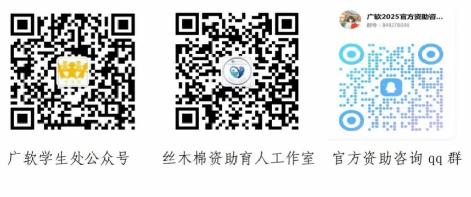 开学前后往往是电信、网络诈骗高发期,一些诈骗分子会冒充大学老师、资助机构工作人员等,给新生发短信、打电话加微信或00好友,用各种手段骗取钱财,或发放互联网消费贷款,引诱学生陷入高额贷款陷阱。请你一定擦亮眼睛,提高警惕,抵住诱惑,避免上当。广州软件学院学生资助政策的官方通知主要通过“广州软件学院学生处”微信公众号(gdhrxsc)、“广软丝木棉资助育人工作室”微信公众号进行发布,请勿轻易相信其他平台推送发布的信息,以免上当受骗。如有疑问,可加入广软 2025 官方资助咨询qq群:849278036,或者拨打我校资助热线电话:020-87818106(每天上午9:00-12:00:下午14:00-17:30)
