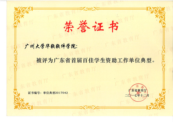 我院认真贯彻国家、广东省各项资助政策,扎实推进精准认定、精准资助,不断创新资助模式、育人模式、宣传模式,推动提升学生资助管理工作整体水平;在学生资助方面,学院每年为鼓励贷款毕业生提前还贷,设立“诚信先锋”奖励机制,并给予一定的“诚信奖”奖励,2018年我院获“2017年度广东省首届百佳学生资助工作单位典型”荣誉称号。