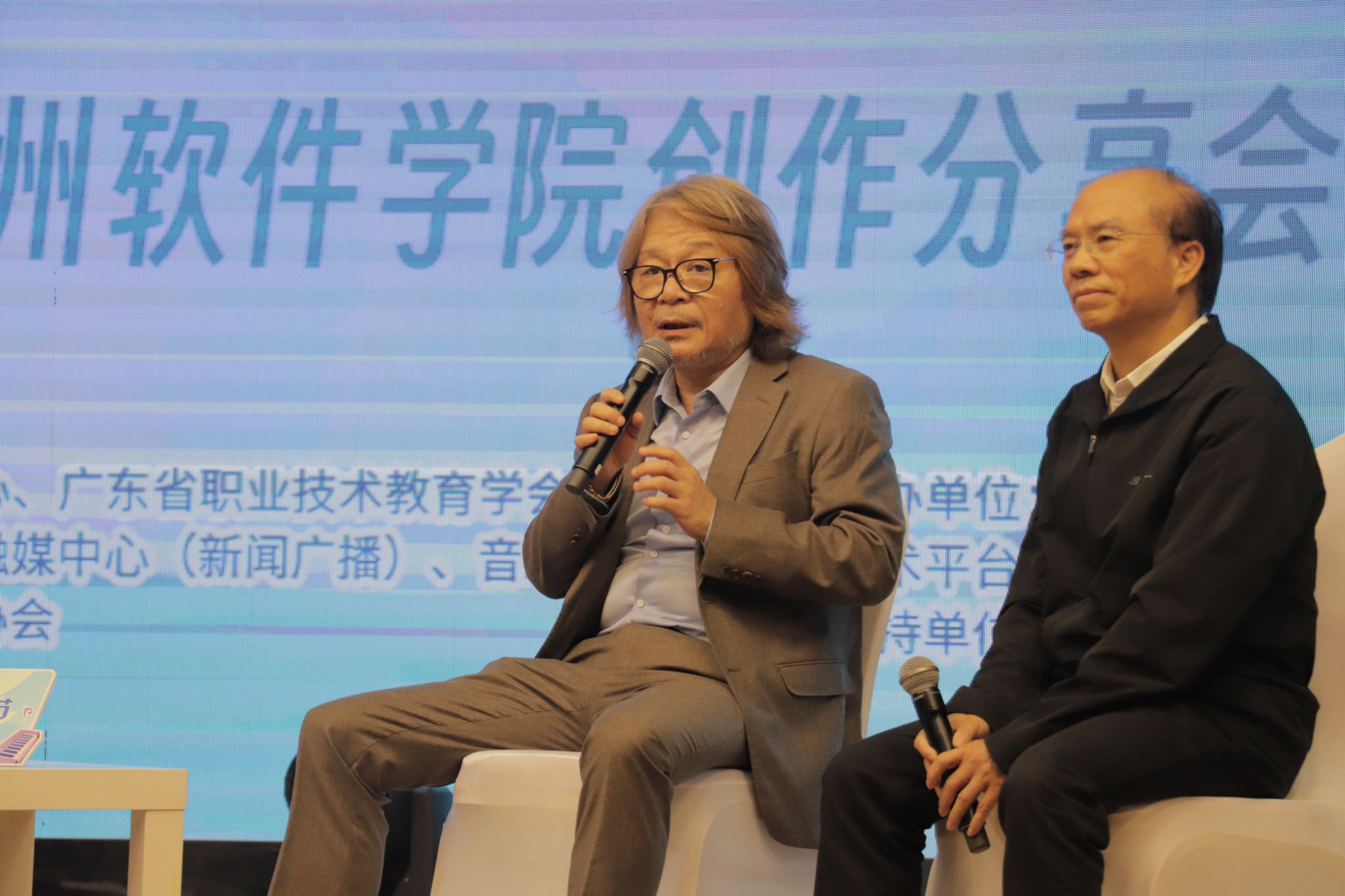 随之而来的“大咖来分享”,行业专家与校内学者围绕AI音乐创作展开深度交流。首轮分享环节,广东省流行音乐协会主席高翔与广州软件学院软件与人工智能学院院长、博士生导师张晓龙教授登台展开对谈。
