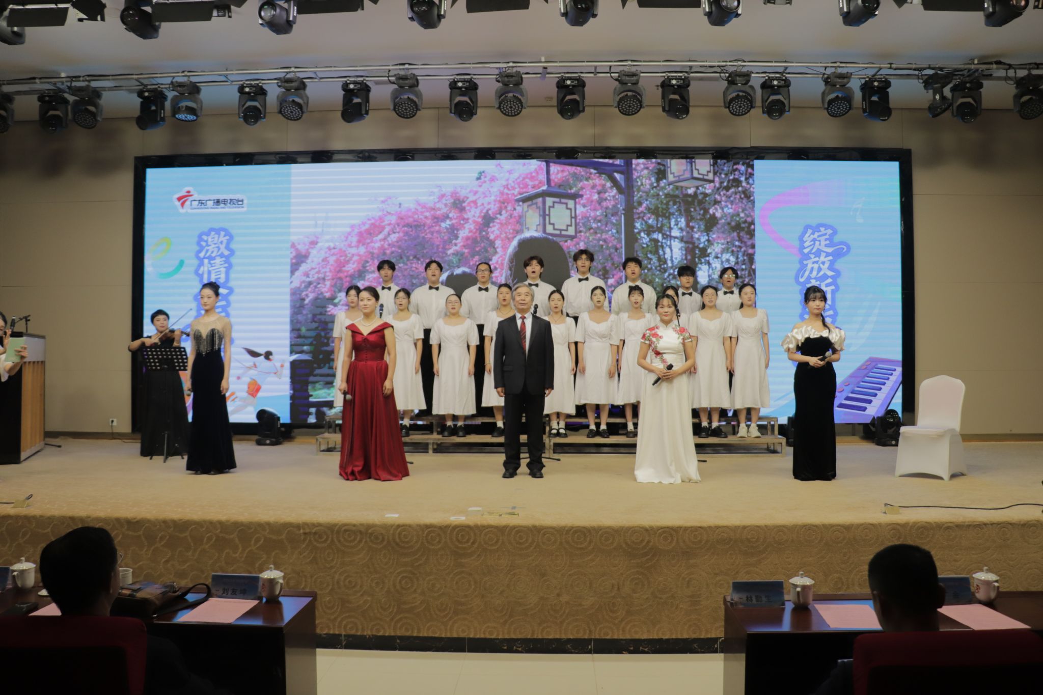 师生表演《流溪水·大学之歌》 朗诵:张海鸥;演唱:谢丽娜、黄蕙、时鑫、江玉婷、学生合唱团钢琴:李超凡、小提琴:肖茜;伴舞:胡蝶